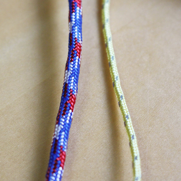 太さは4mmということで、ダイニーマ リフレクティブ ガイラインと比べてみますと、こんな感じ。2倍以上の太さを感じますね(断面積で言えば4倍になりますしね)。