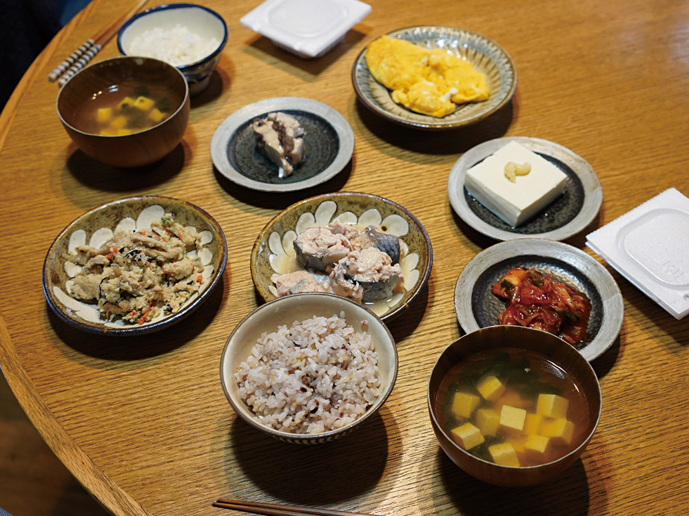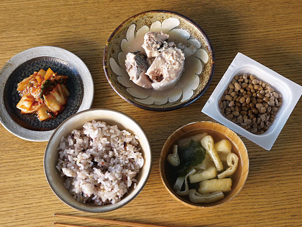 (時計周り)十六穀米、キムチ、サバ缶、納豆、味噌汁……塩分過多ですね