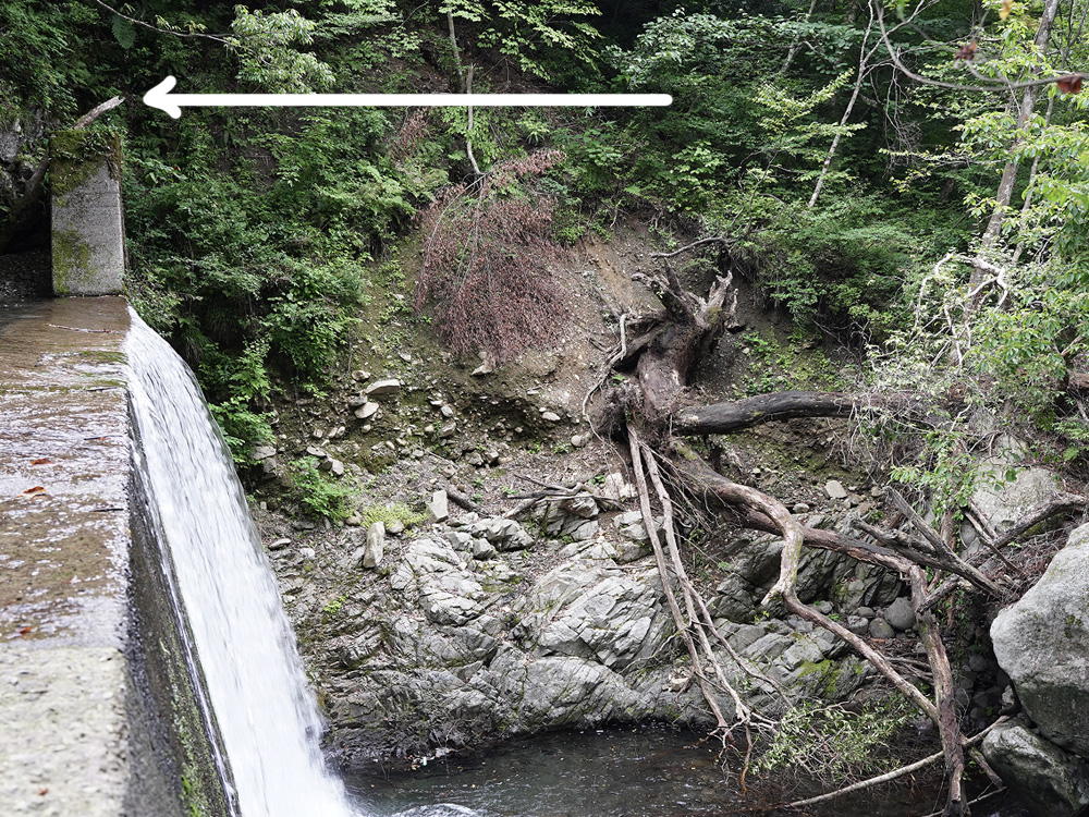 キャンプ地である河原に到達するには、高さ10メートル近い堰堤を越える必要があり、以前は階段から続く遊歩道がかろうじて残っていたものの、大きな木が倒れたことによって斜面自体が崩壊し、遊歩道は完全になくなっていました。